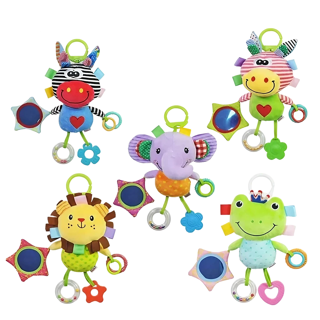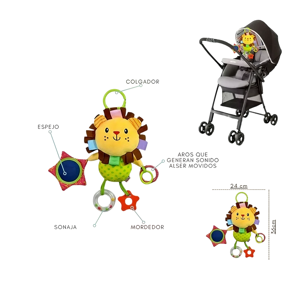 ¡Estimula los sentidos de tu bebé con nuestro colgante sensorial con espejo! Incluye un colgador, espejo y juguetes que generan sonidos al ser movidos. Mide 24x36cm y ayuda con su estimulación auditiva y sensorial. ¡Haz que cada paseo sea divertido y educativo con este colgante para coches de bebé!