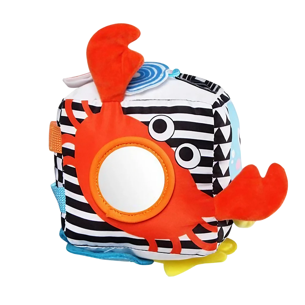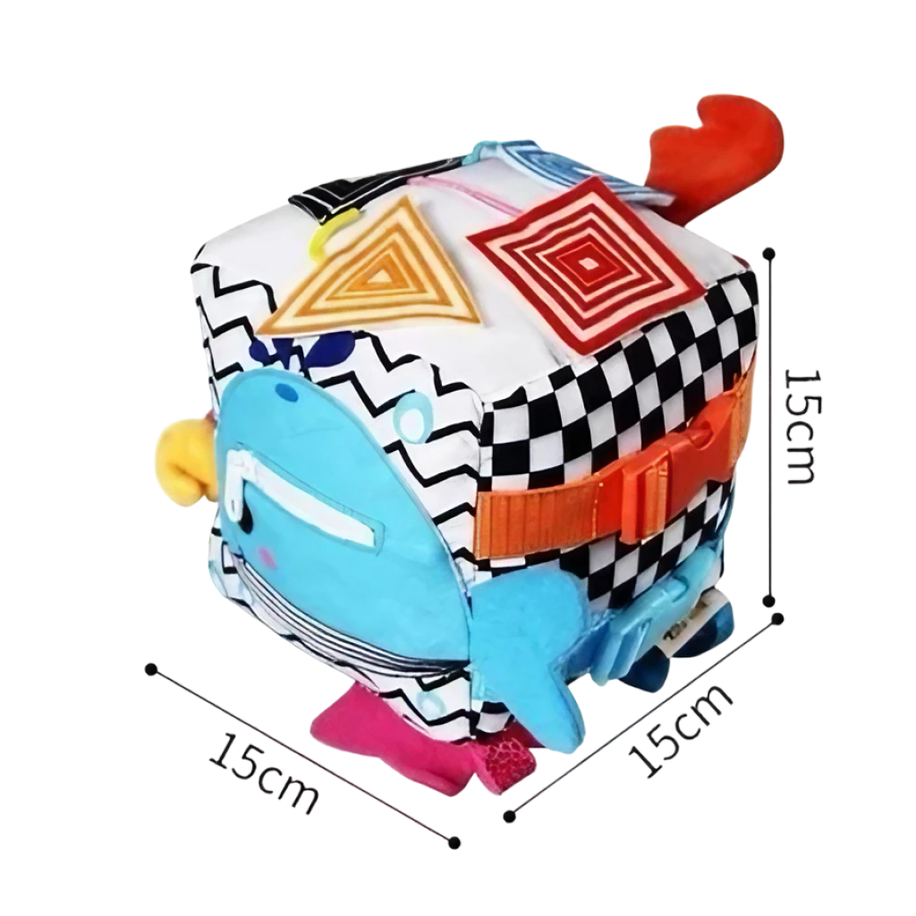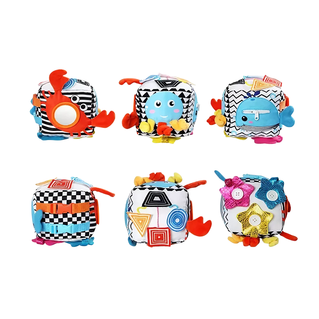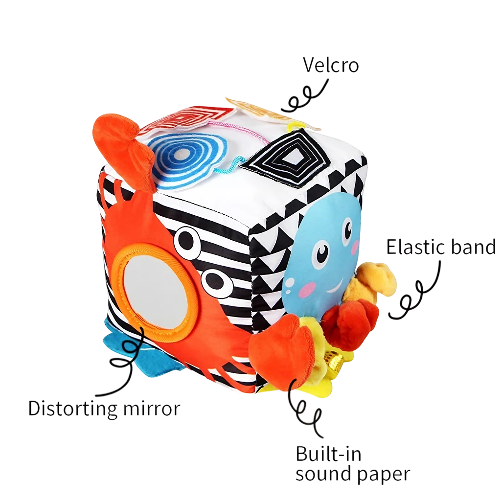 ¡Estimula los sentidos y desarrolla habilidades motoras finas desde temprana edad con nuestro CUBO SENSORIAL MARINO 6 EN 1! Colores vivos, patrones únicos y variedad de texturas en cada uno de sus seis lados. Incluye espejo, ligas, cierre, botones y más. ¡Una experiencia completa y entretenida para tu bebé!