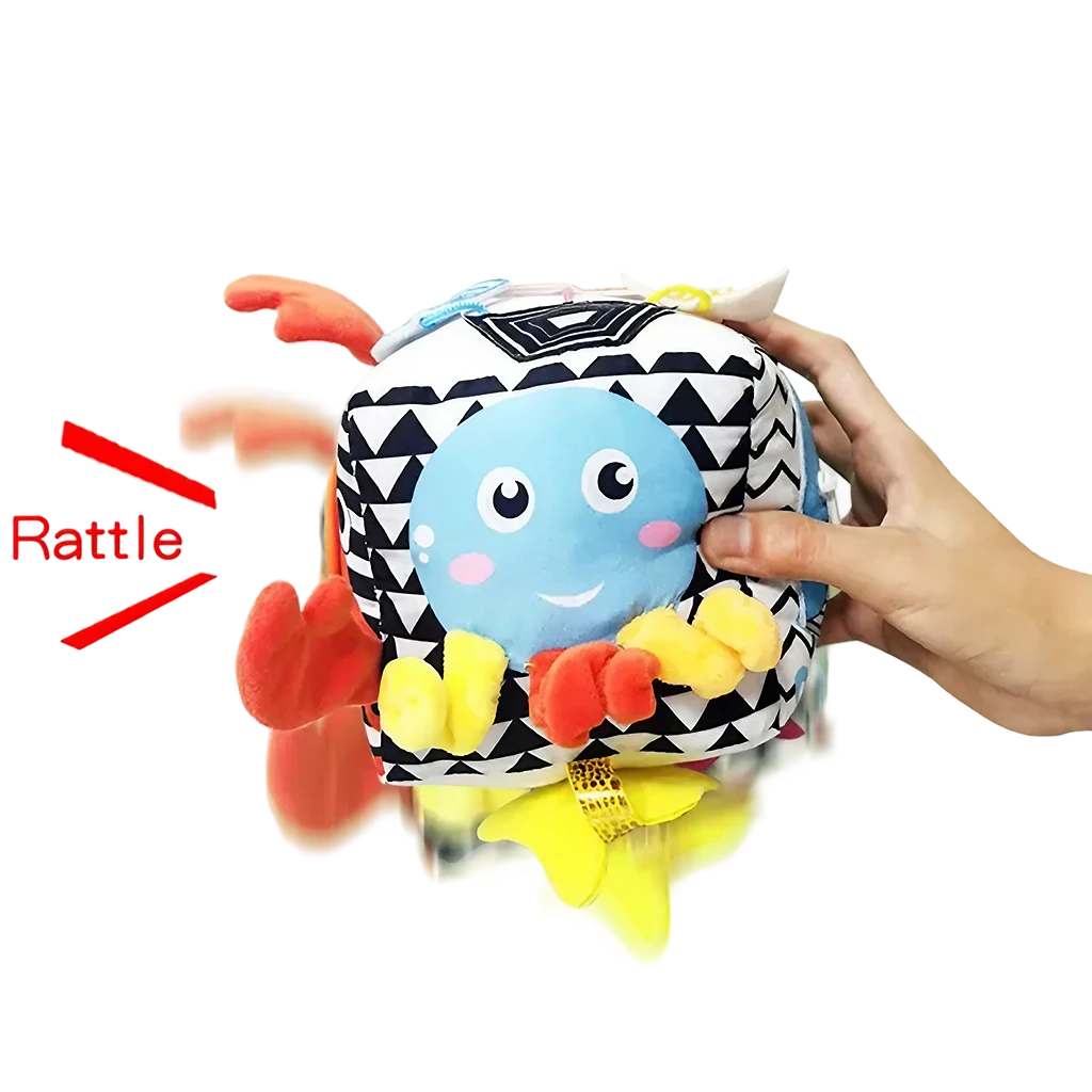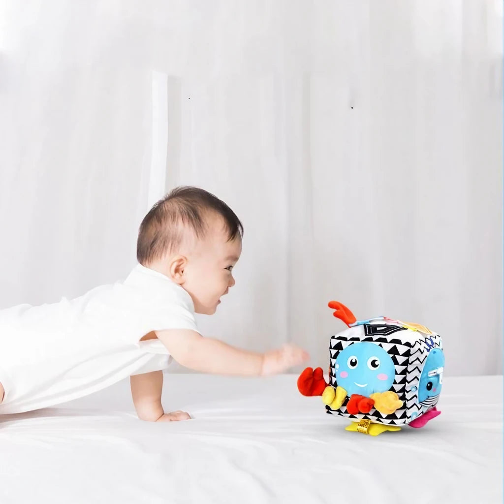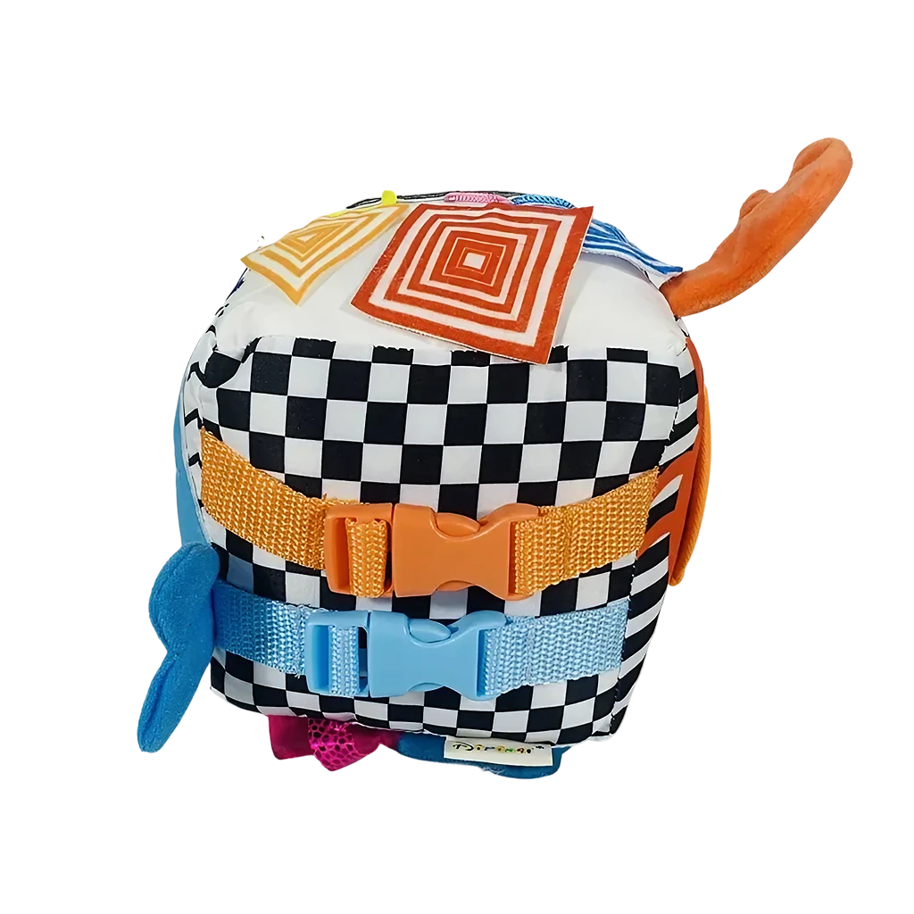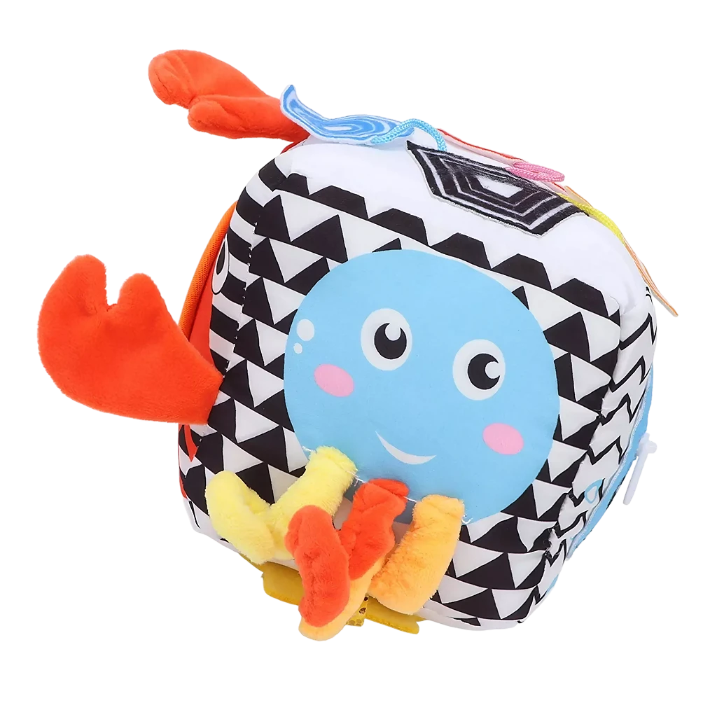 ¡Estimula los sentidos y desarrolla habilidades motoras finas desde temprana edad con nuestro CUBO SENSORIAL MARINO 6 EN 1! Colores vivos, patrones únicos y variedad de texturas en cada uno de sus seis lados. Incluye espejo, ligas, cierre, botones y más. ¡Una experiencia completa y entretenida para tu bebé!