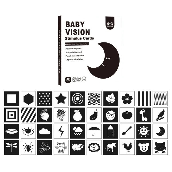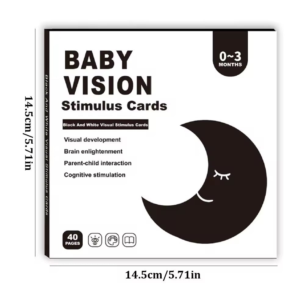 Estas 20 tarjetas de estimulación en alto contraste están especialmente diseñadas para bebés desde el nacimiento hasta los 3 meses. Los patrones en blanco y negro capturan la atención del bebé, estimulando su visión y ayudando a desarrollar la memoria instantánea. Usarlas diariamente favorece las habilidades cognitivas y fortalece el cerebro derecho, promoviendo un aprendizaje temprano y efectivo. Un apoyo esencial para el desarrollo visual y mental de tu bebé desde sus primeros días.
