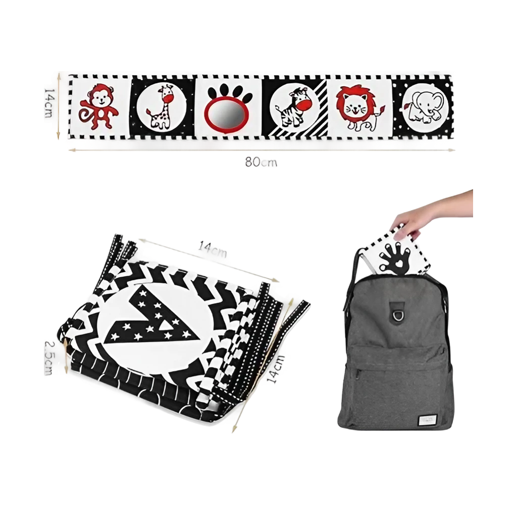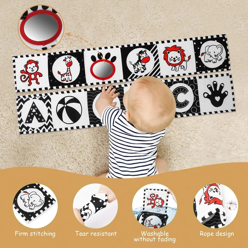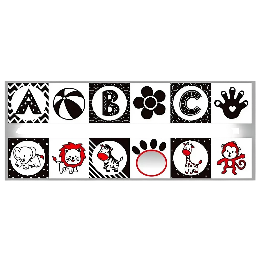 ¡Despierta la curiosidad de tu bebé con nuestro Libro Black and White! Hecho de tela suave, este libro de juguetes educativos de alto contraste en blanco y negro es el regalo perfecto para bebés de 0 a 12 meses. Incluye un espejo para estimular su visión ¡y brindar horas de diversión en la cuna o en la cama de actividades!
