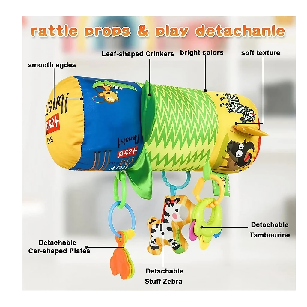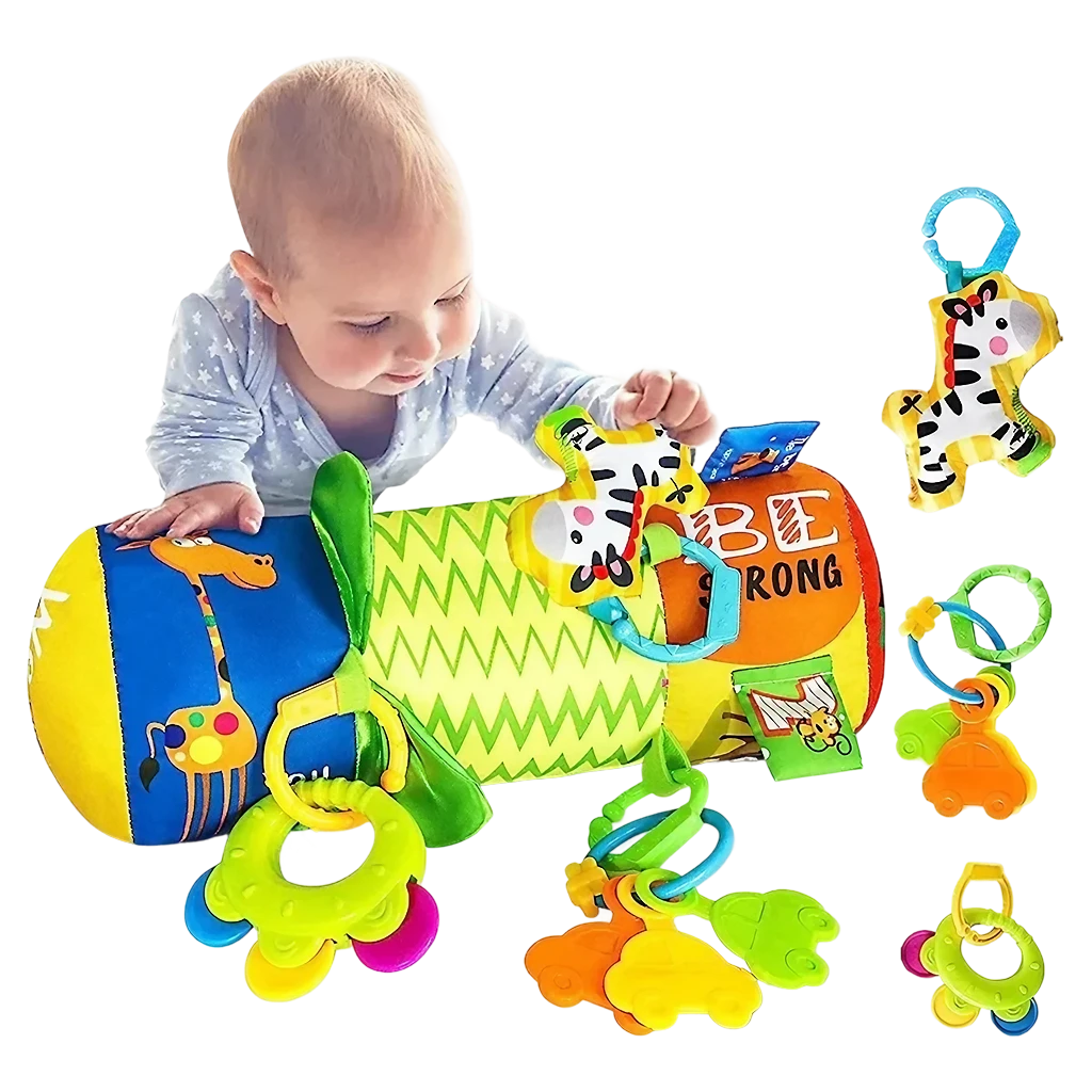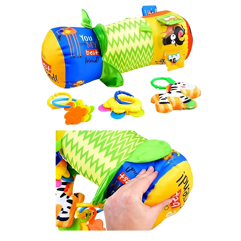¡Estimula el crecimiento de tu bebé con nuestro RODILLO ESTIMULACION! Ideal para facilitar el gateo, este acolchado rodillo es perfecto para juegos boca abajo. Con tres juguetes enlazables, como mordedores y una zebra que cruje, tu pequeño se divertirá mientras desarrolla sus habilidades motoras y sensoriales. ¡Aprender es más divertido con este rodillo! ¡Haz que tu bebé se sienta cómodo y seguro mientras aprende y crece!