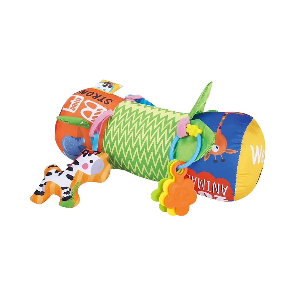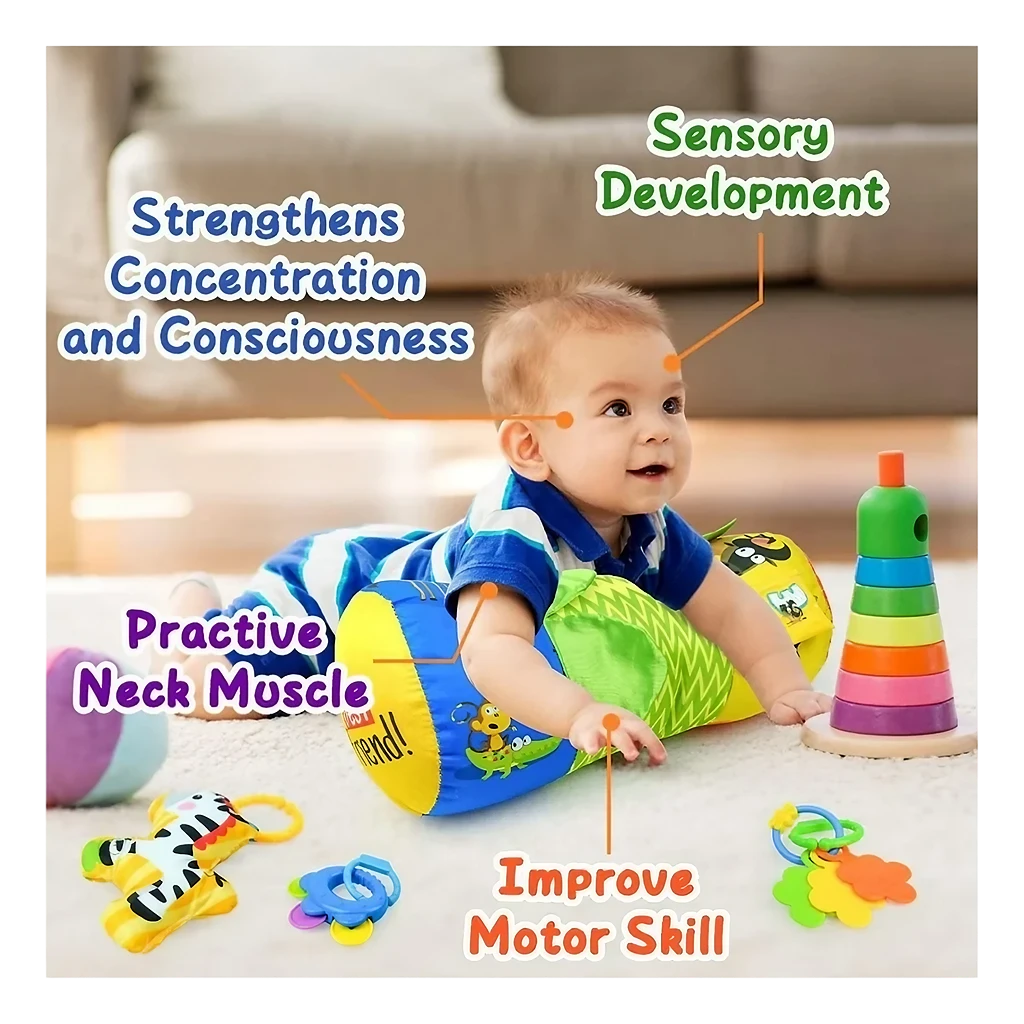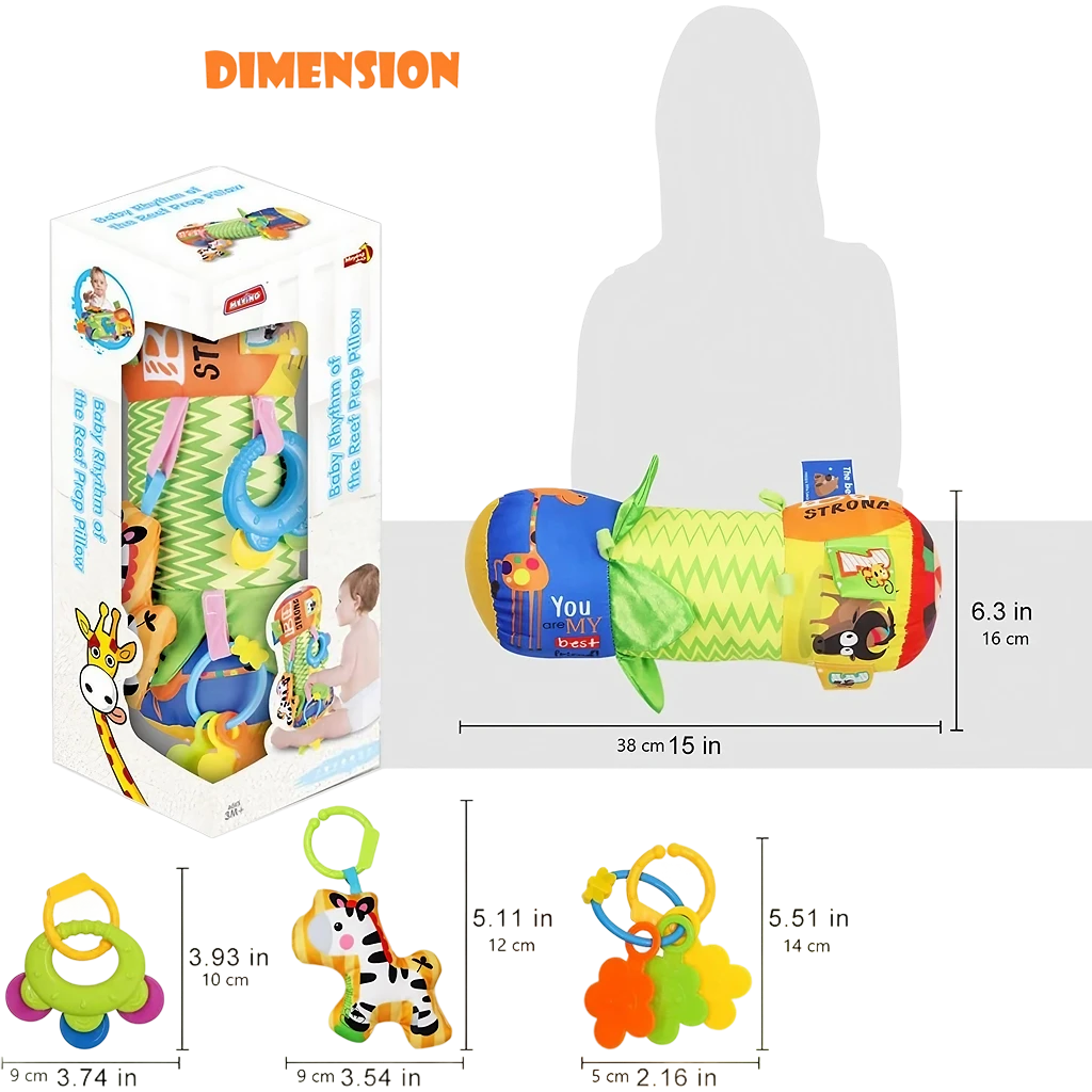 ¡Estimula el crecimiento de tu bebé con nuestro RODILLO ESTIMULACION! Ideal para facilitar el gateo, este acolchado rodillo es perfecto para juegos boca abajo. Con tres juguetes enlazables, como mordedores y una zebra que cruje, tu pequeño se divertirá mientras desarrolla sus habilidades motoras y sensoriales. ¡Aprender es más divertido con este rodillo! ¡Haz que tu bebé se sienta cómodo y seguro mientras aprende y crece!