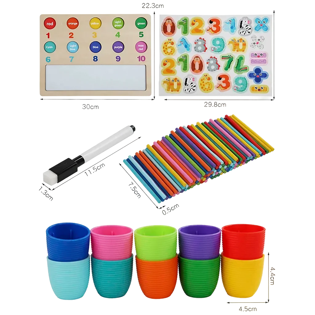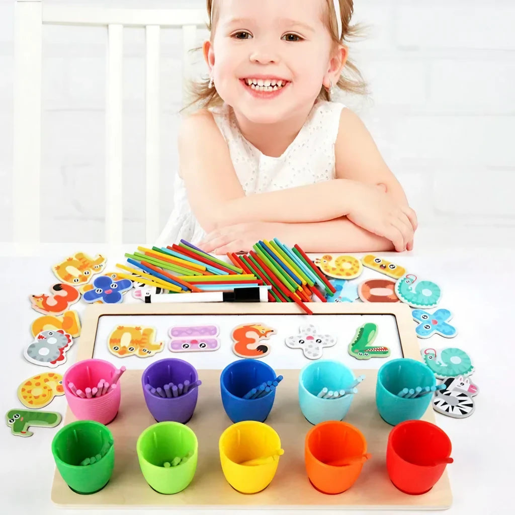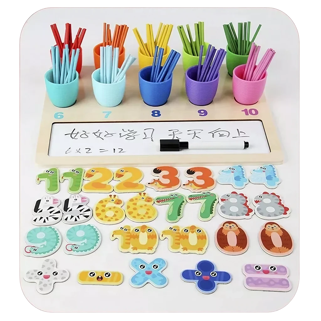 Descubre la diversión de aprender operaciones matemáticas con este tablero imantado Montessori. Estimula la imaginación de tu pequeño con contadores de madera y juegos de aprendizaje educativos. Incluye 10 tazas, 10 palillos, una tabla con pizarra, plumón, 22 números imantados y 5 operadores matemáticos. ¡Inspíralo a experimentar y explorar la magia de la matemática!