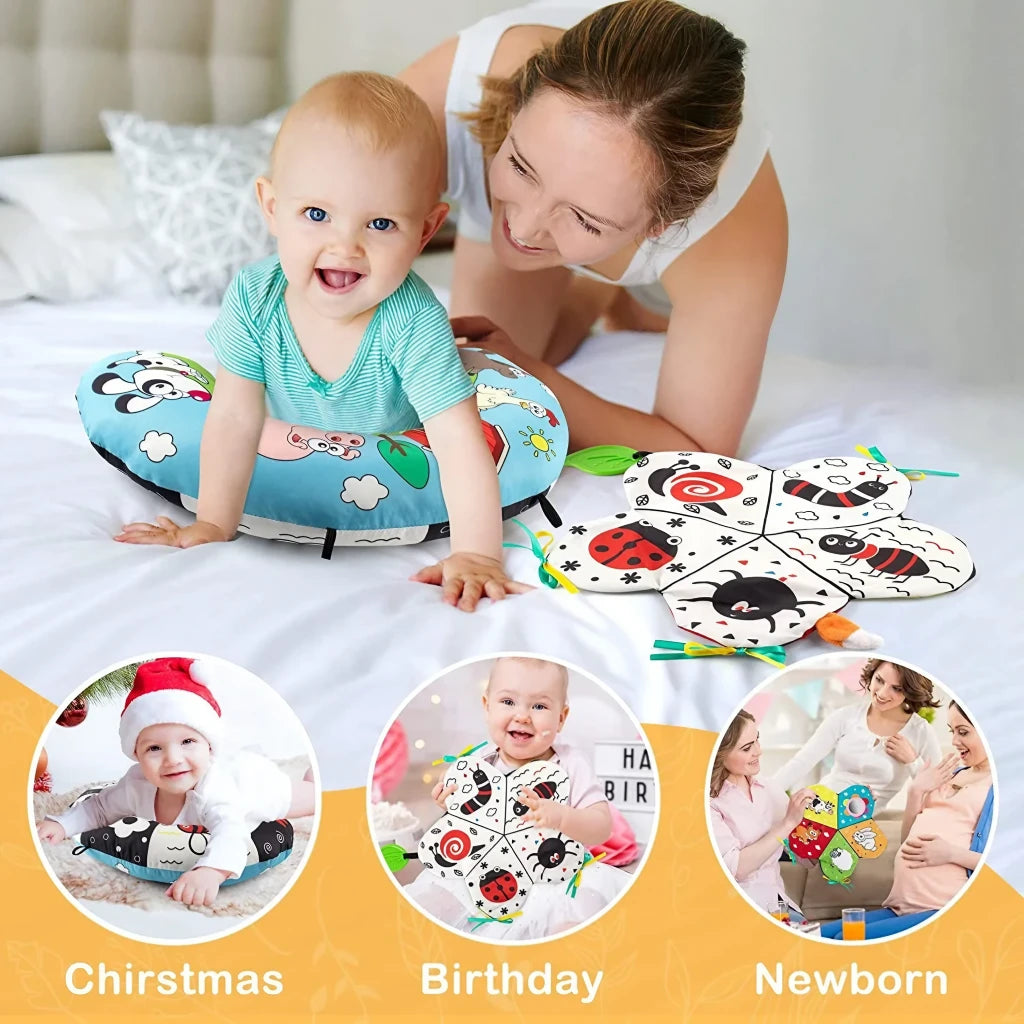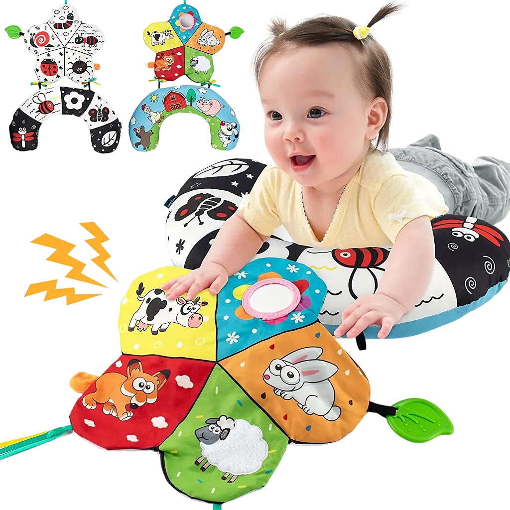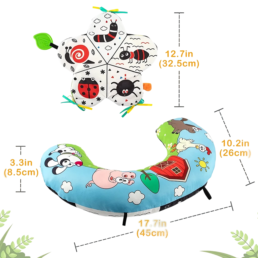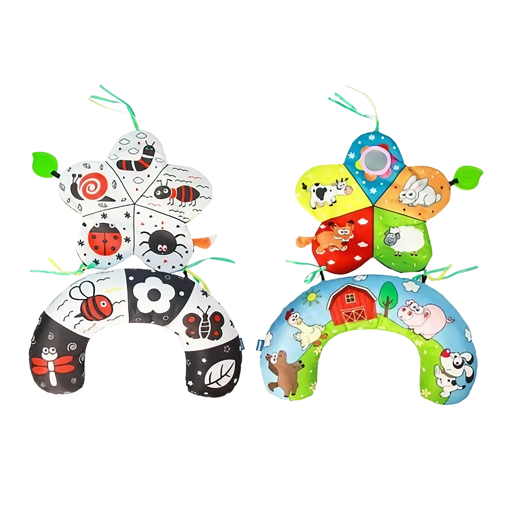 ¡Desarrolla la estimulación temprana de tu bebé con la almohada sensorial! La alfombra de juegos para bebés ofrece 3 posiciones para el crecimiento del bebé: jugar acostado, boca abajo y sentado, con juguetes colgantes para entretenerlos. Además, los bordes acolchados protegen a tu bebé y promueven la estimulación visual y auditiva en los primeros 3 meses.